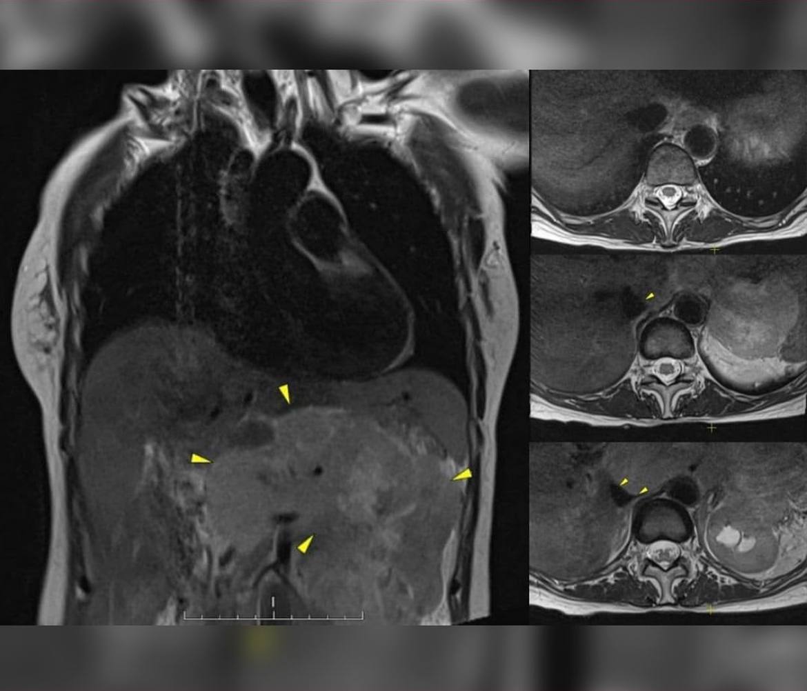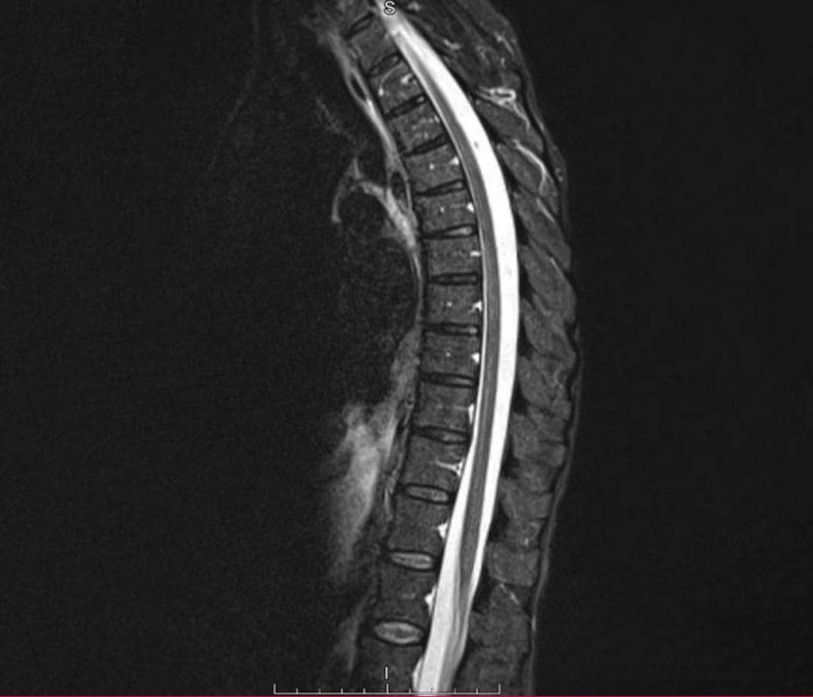 Женщину на протяжении длительного периода времени беспокоили нарастающие, скручивающие, тянущие боли в грудном и поясничном отделе позвоночника. Боли усиливались при движении, а именно при укладывании на спину и левый бок. При этом ощущались слабость и онемение правой руки.