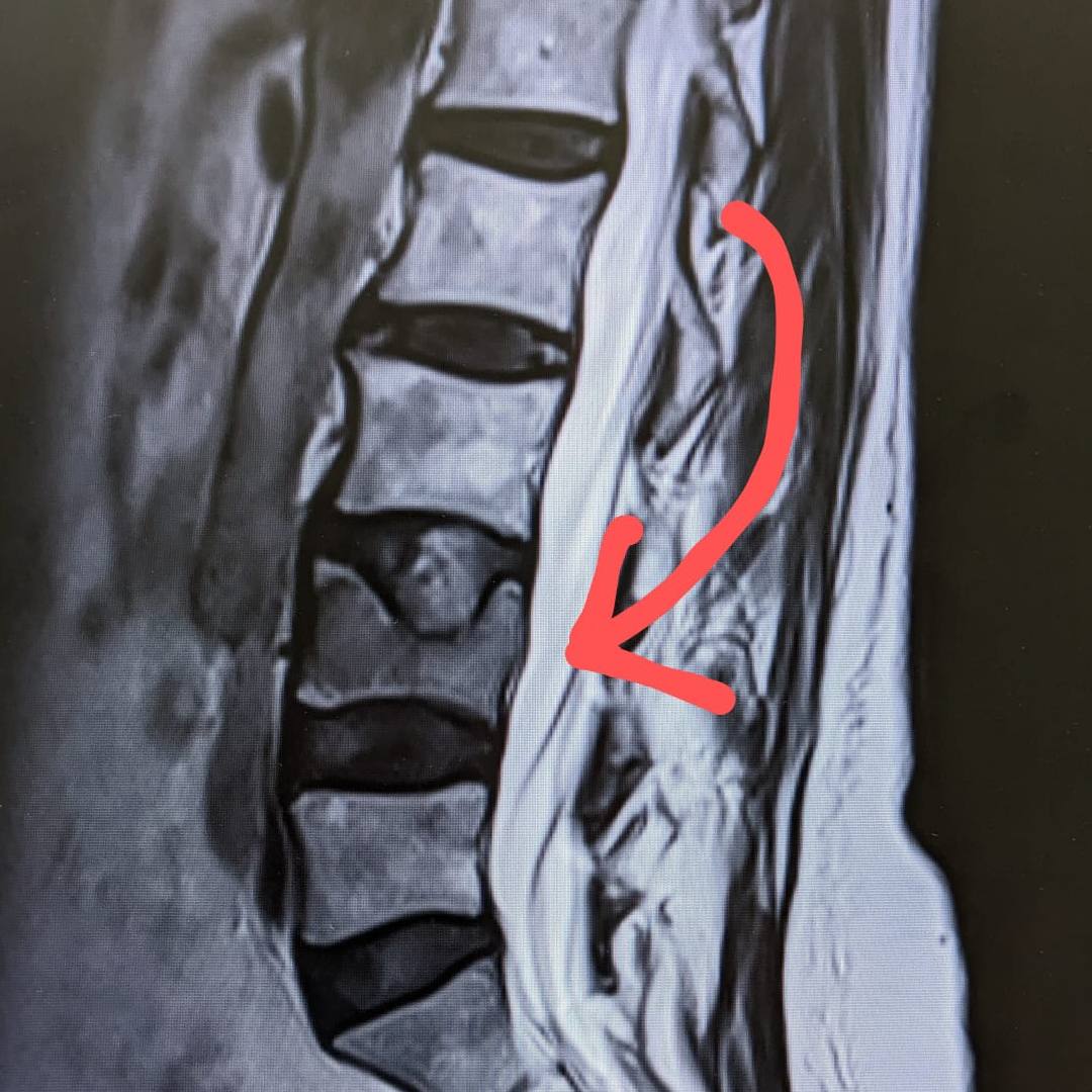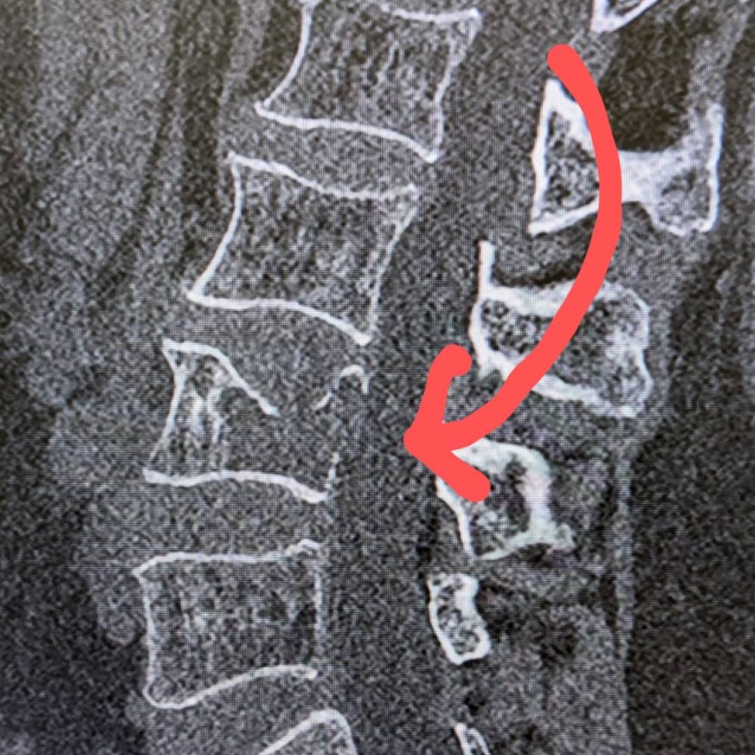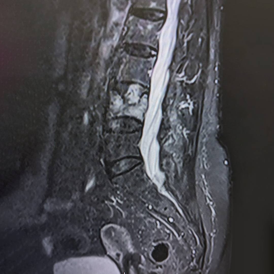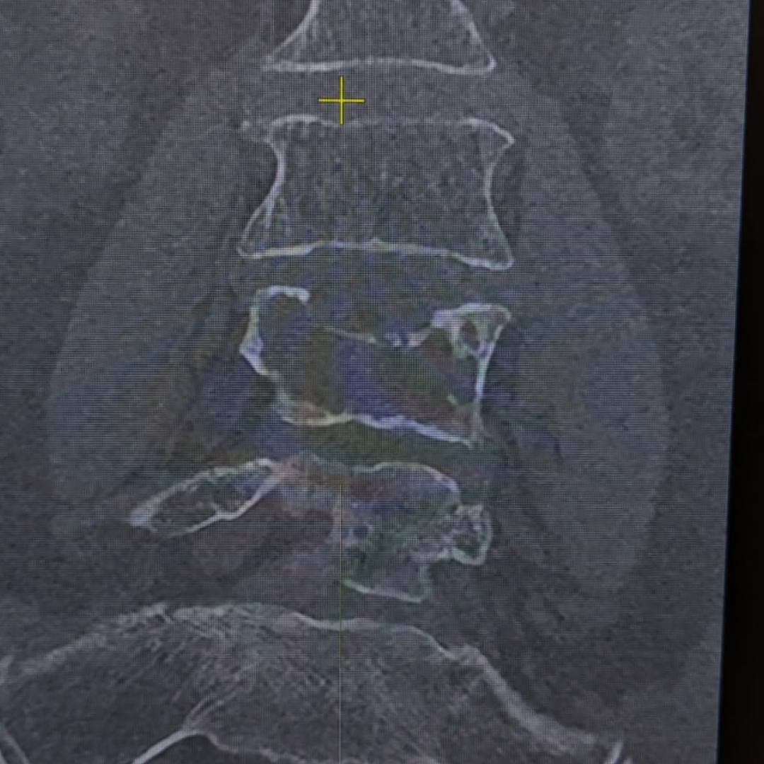 При магнитно-резонансной томографии был выявлен перелом четвертого поясничного позвонка на фоне мягкотканого образования в теле позвонка, вследствие чего пациентке было предложено выполнить дообследование в виде компьютерной томографии.