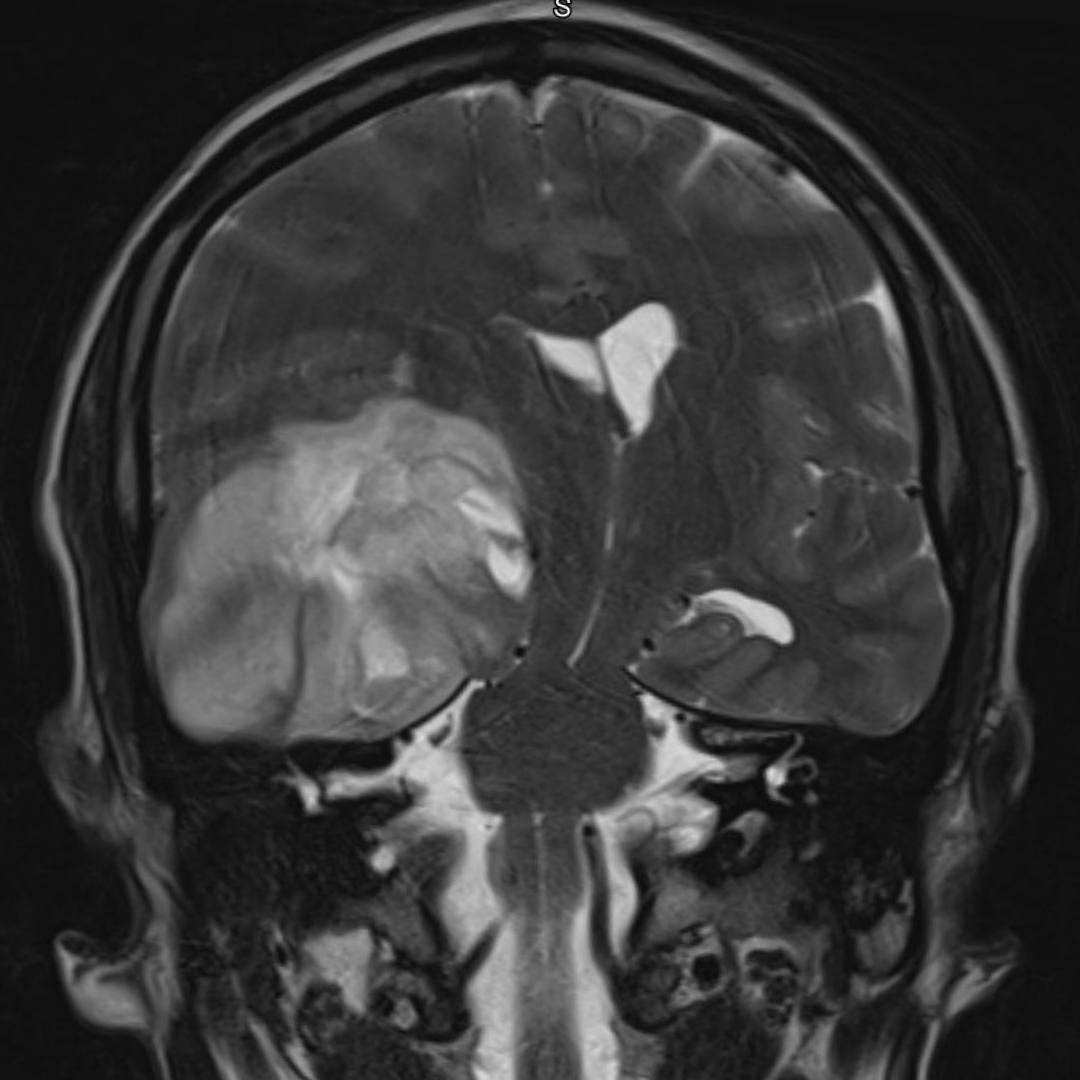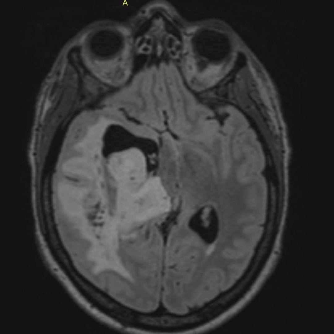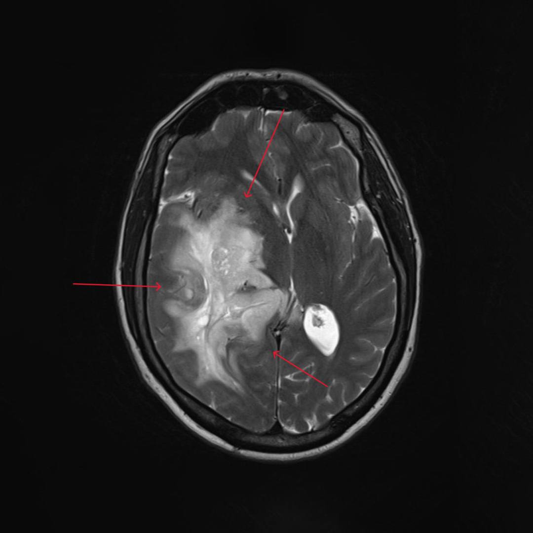 При проведении МРТ головного мозга выявлена опухоль правой височно-теменной области с переходом на островок, вовлечением базальных ядер справа и мозолистого тела с выраженным перифокальным отеком с дислокацией срединных структур мозга влево, компрессией правых бокового и третьего желудочков, среднего мозга.