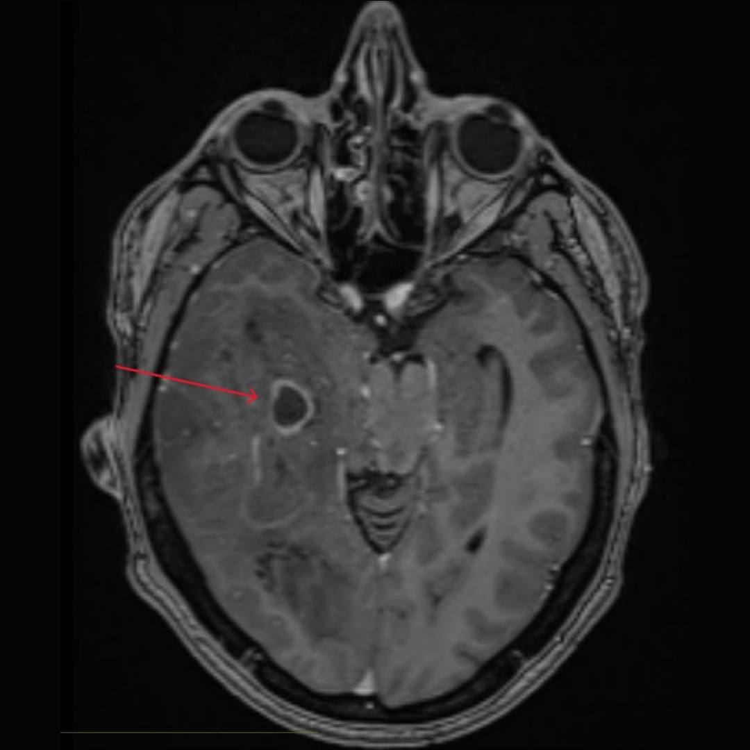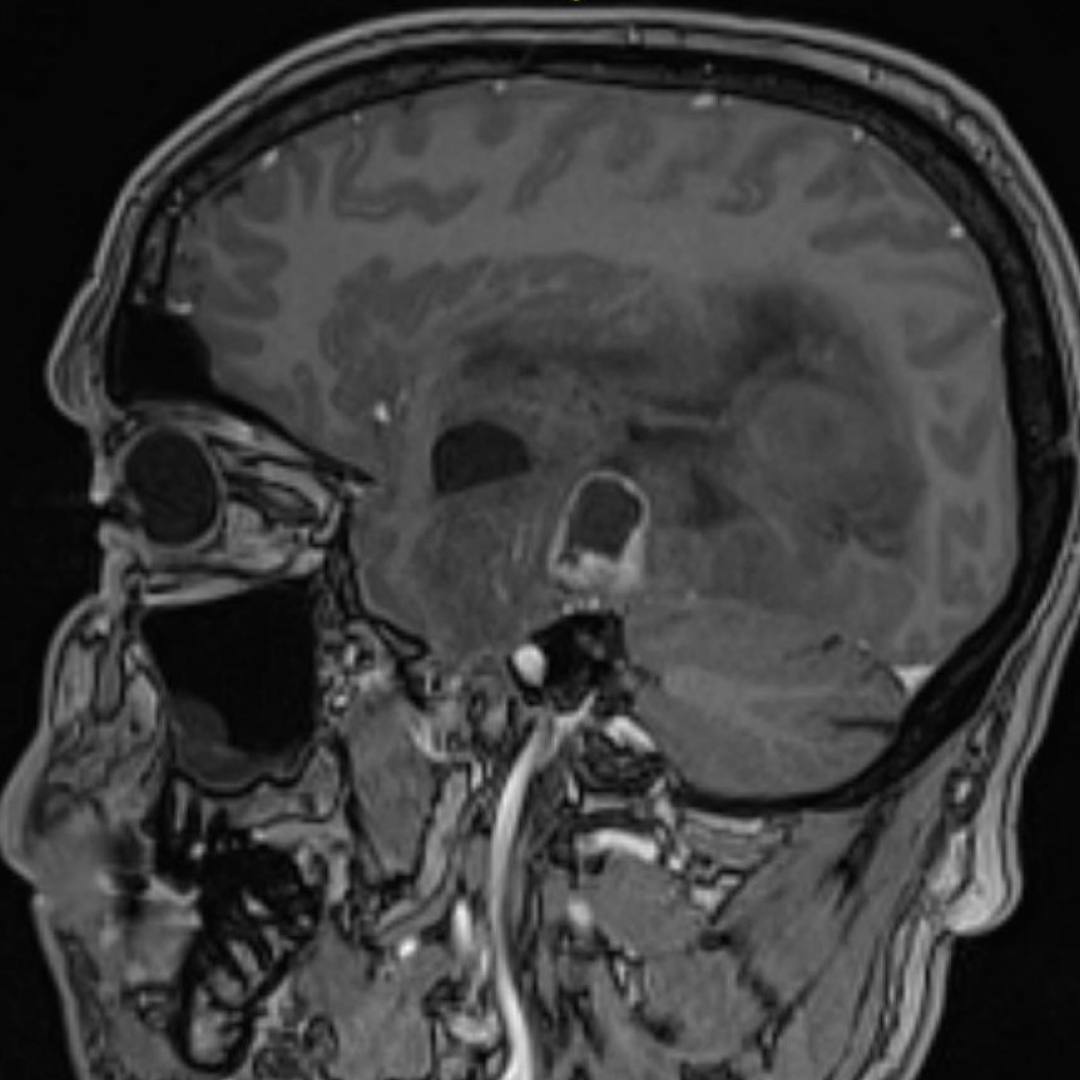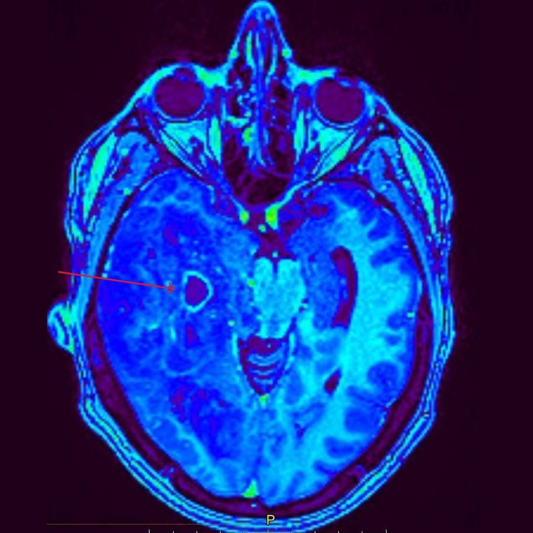 При проведении МРТ головного мозга выявлена опухоль правой височно-теменной области с переходом на островок, вовлечением базальных ядер справа и мозолистого тела с выраженным перифокальным отеком с дислокацией срединных структур мозга влево, компрессией правых бокового и третьего желудочков, среднего мозга.