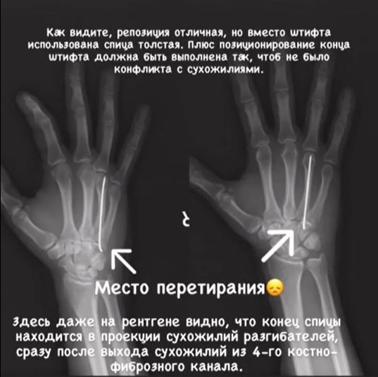 Случай несложный, однако в результате операции развилось осложнение − перестали разгибаться 3-4 пальцы кисти. Штифт-спицу удалили, перелом сросся, но осложнение осталось. Пациент не мог разгибать пальцы, а для хирурга это губительно!